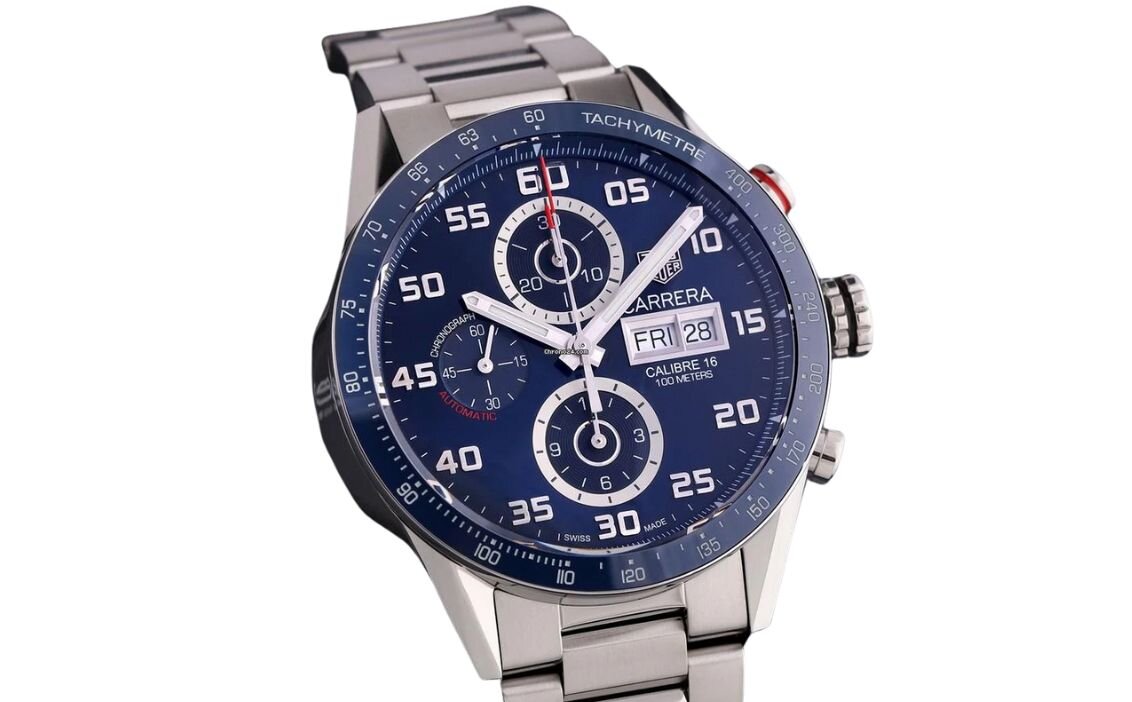 Blue Sunray Dial & Ceramic Bezel: Striking blue dial with polished ceramic tachymeter bezel
